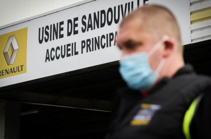 A worker of the Renault factory of Sandouville, near Le Havre, northwestern France, wears a protective facemask as he stands...